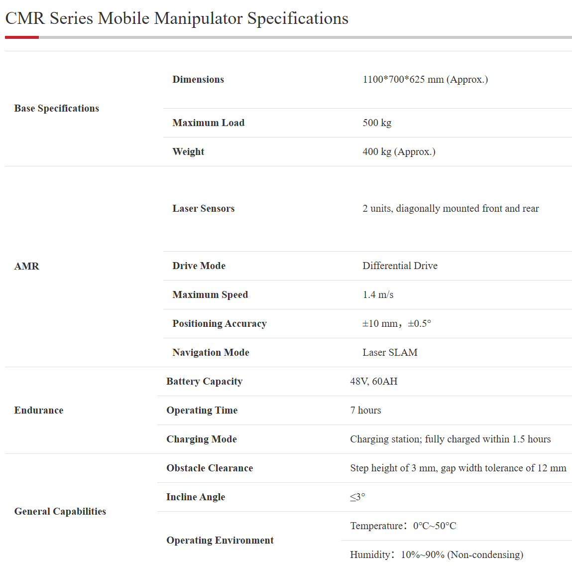 AMR Forklift Specifications: Rated Load Capacity (kg) 2000 Combined Endurance (h) 6-8 Standard Lift Height (mm) 3000 Travel Speed: Fully Loaded/Unloaded (m/s) 1.5 Minimum Turning Radius (mm) 1577 Positioning Accuracy (mm, °C) ±10mm ±1