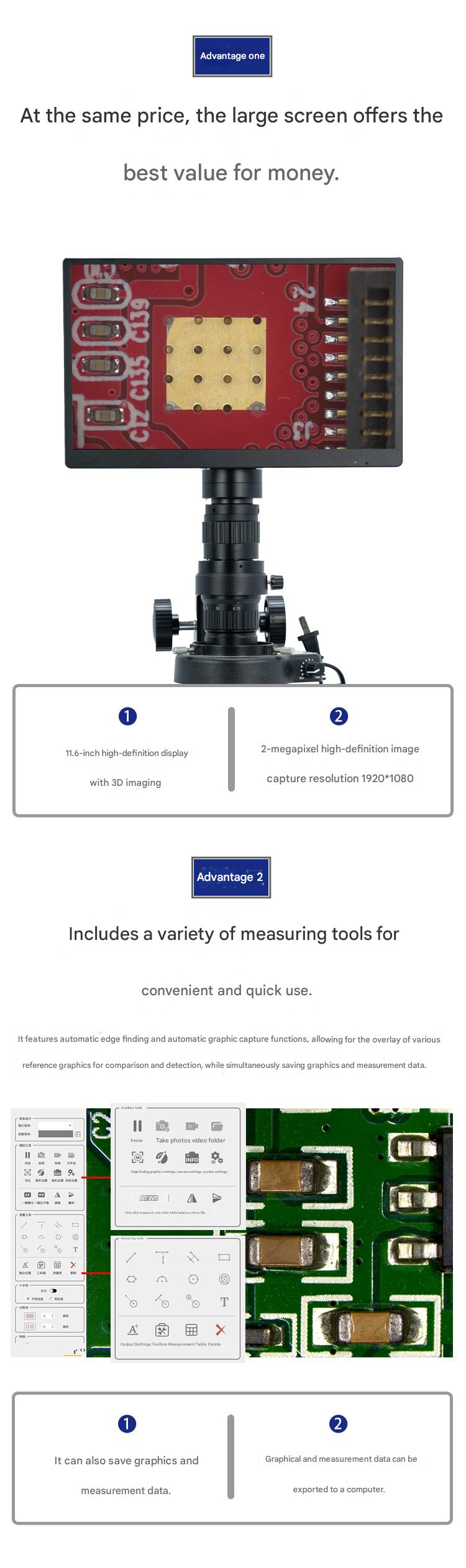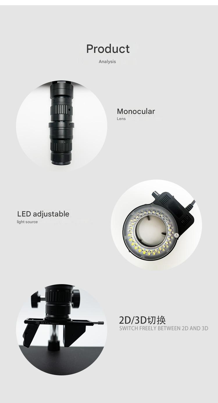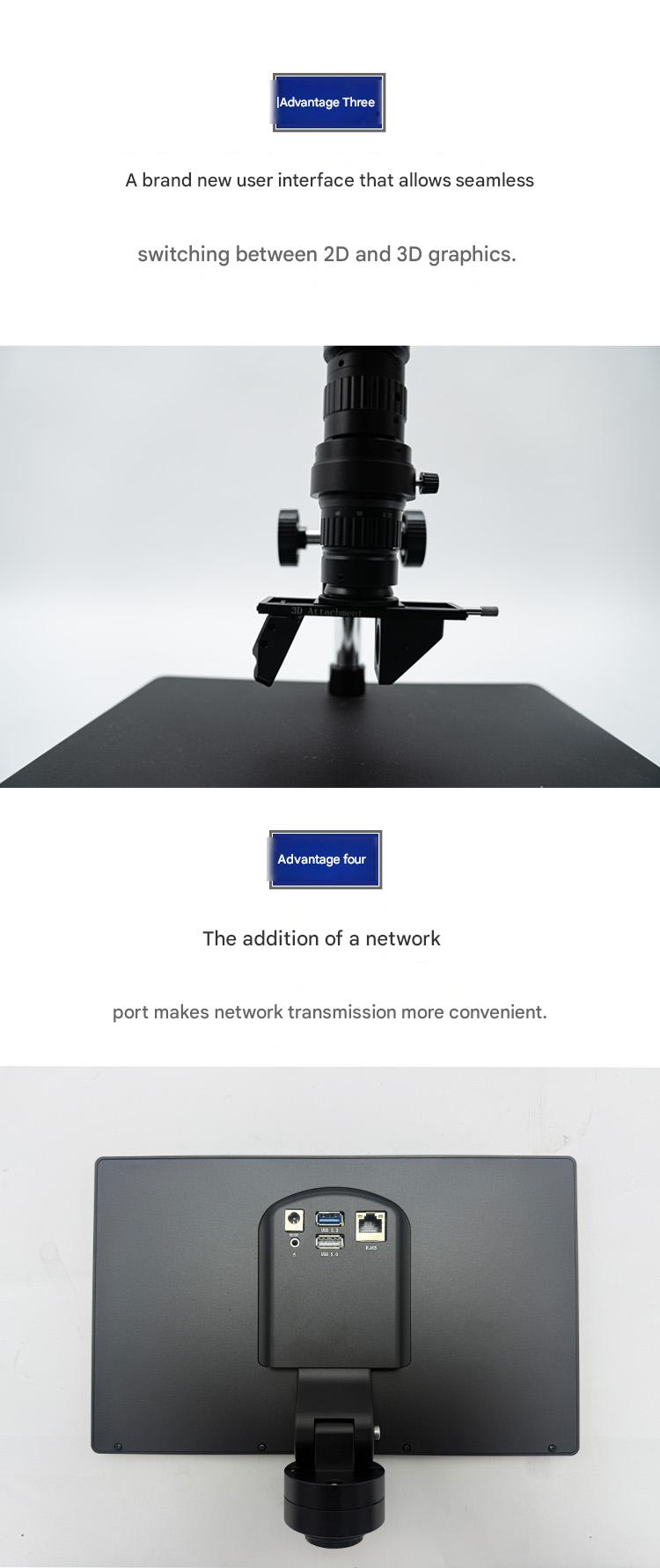 3d Digital Microscope Features: *Three-dimensional viewing plane 3D mode can be switched *Light source continuous reading adjustable 0.7-4.5X optical magnification adjustable *Image storage Frame freeze, image comparison *Strong light suppression, edge enhancement *Color Independent Adjustment *White balance adjustment Automatically adjust exposure *High speed 60 frames per second Mouse operation, U disk read and write