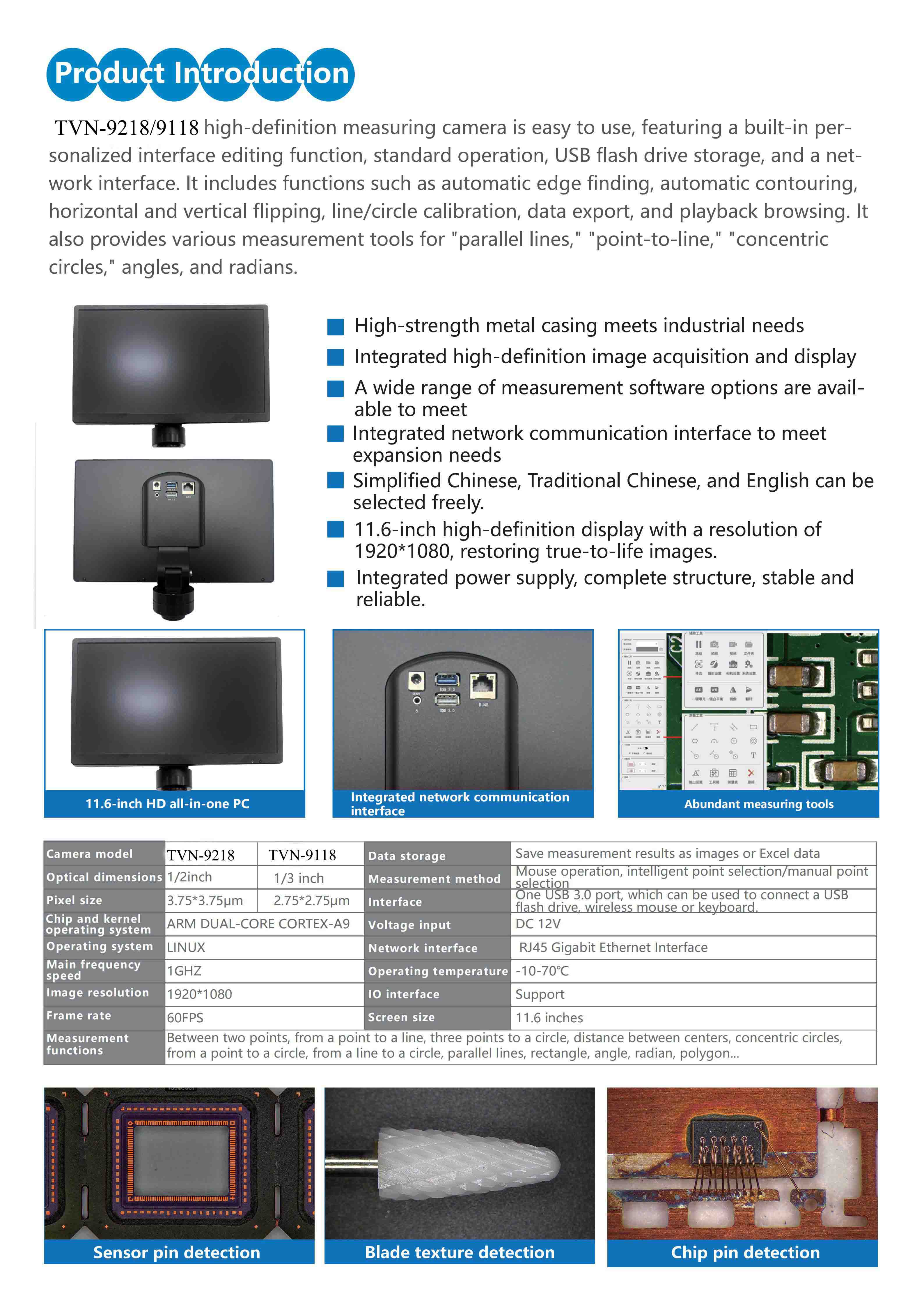 Model: TVN-SmartGo Type: Smart Vision Inspection Camera Resolution: 1600 x 1400 Frame rate: Color/Black and White Network interface: 100Mbps Video interface: HDMI IO interface: IO interface, RS232, power interface USB interface: 2 Storage method: U disk storage
